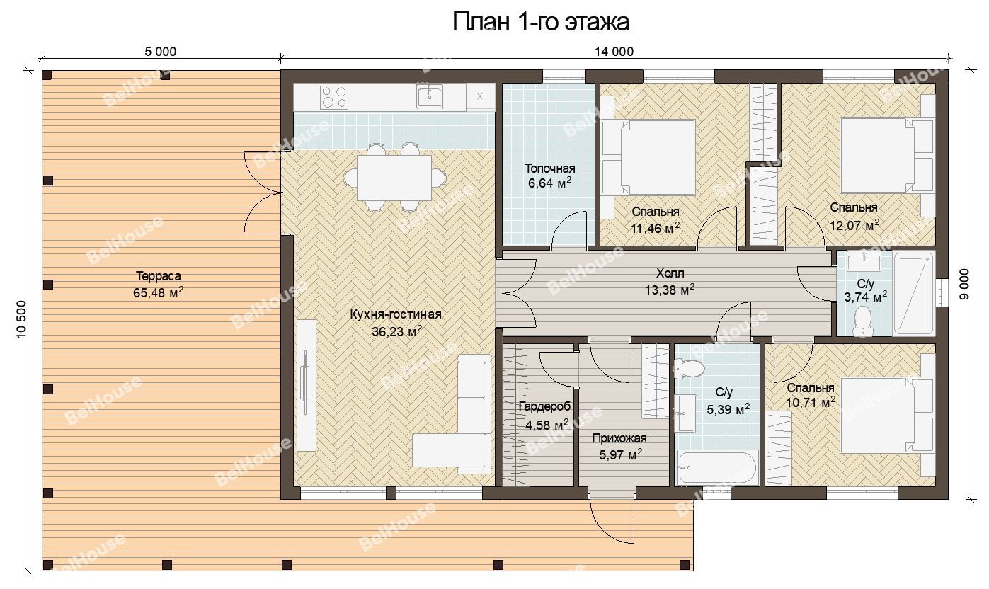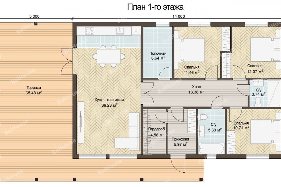 Каркасный дом, проект №365 Общая площадь 126 м2 Размер дома 9х14 м Комнаты 4 Спальни 3 Санузлы 2 от 3 654 000 ₽ от 30694 ₽/месяц в ипотеку с господдержкой Консультация Подробнее