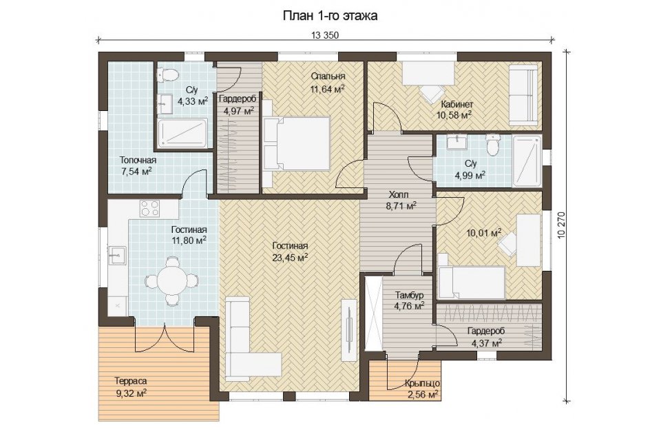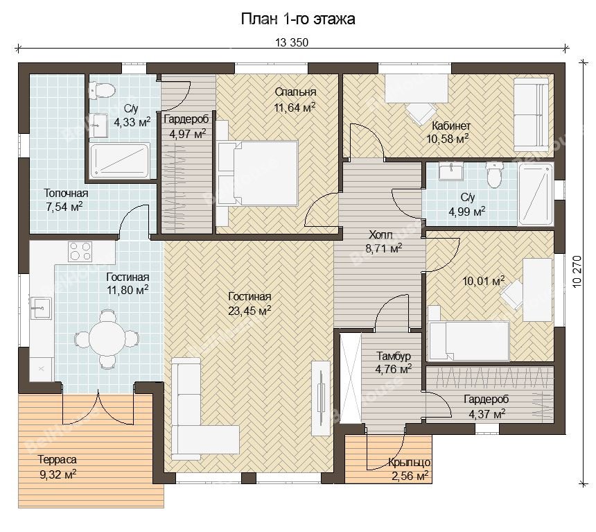 Каркасный дом, проект №268 Общая площадь 115 м2 Размер дома 10x11 м Комнаты 4 Спальни 3 Санузлы 2 от 3 335 000 ₽ от 28014 ₽/месяц в ипотеку с господдержкой Консультация Подробнее