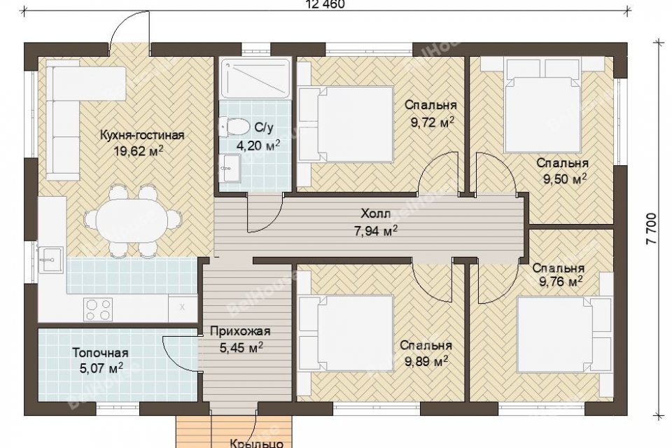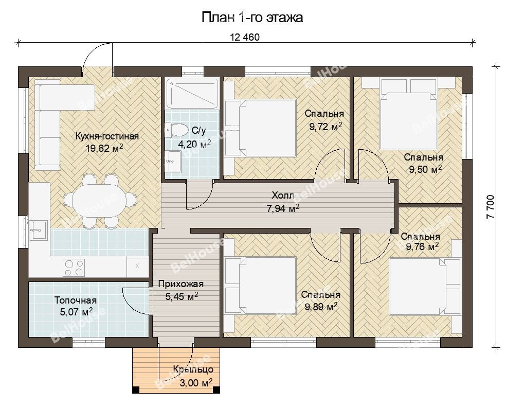 Каркасный дом, проект №359 Общая площадь 105 м2 Размер дома 15x8 м Комнаты 4 Спальни 3 Санузлы 2 от 3 045 000 ₽ от 25578 ₽/месяц в ипотеку с господдержкой Консультация Подробнее