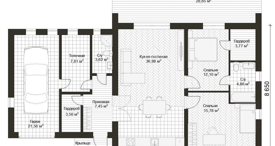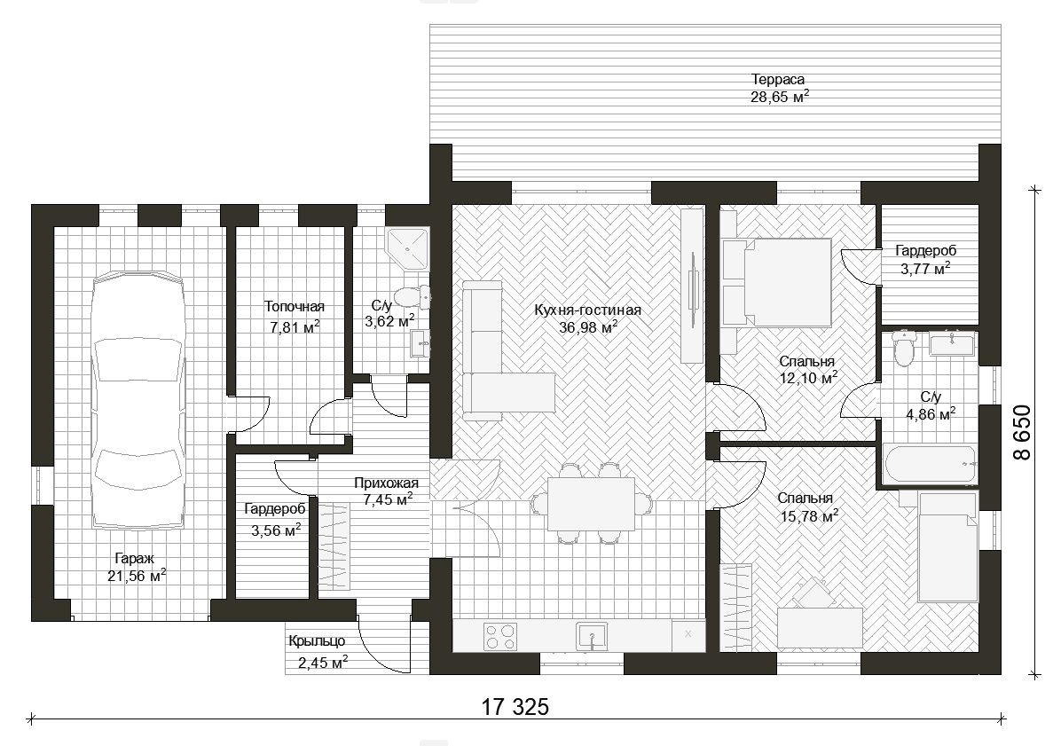 Проект одноэтажного дома из газобетона общей площадью 131.6 кв. м представляет собой современное и уютное жилье, идеально подходящее для комфортной семейной жизни. Общая площадь включает жилую площадь 116,5 кв. м, которая разделена на просторную кухню-гостиную и две уютные спальни. Два санузла обеспечивают удобство и функциональность. Важным элементом проекта является наличие гаража, обеспечивающего безопасное хранение автомобиля и дополнительное пространство для хозяйственных нужд. Архитектурное решение сочетает в себе современные тенденции и практичность, делая этот дом идеальным выбором для семей, ценящих комфорт и стиль.