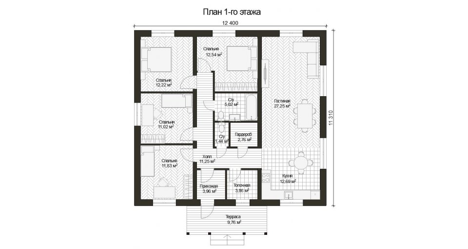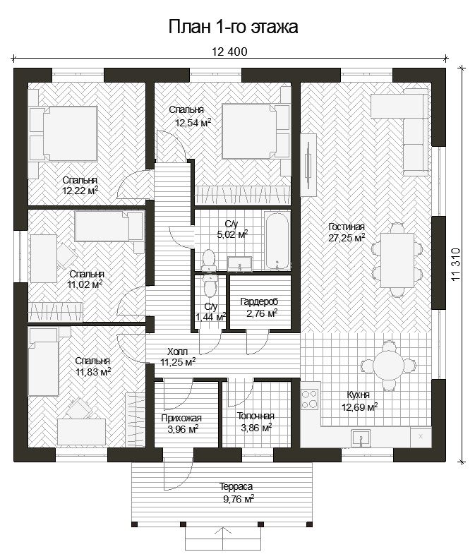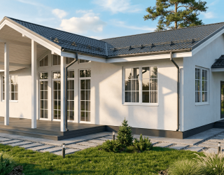 Уютный и просторный дом из газобетона по проекту №190 имеет общую площадь 126,6 квадратных метров и прекрасно подходит как для постоянного проживания, так и для отдыха большой компании. В планировке дома предусмотрены: четыре спальни, туалет, совмещенный санузел, тамбур, просторный холл, топочная, большое крытое крыльцо-терраса, кухня и гостиная-столовая.