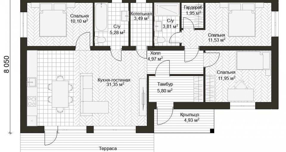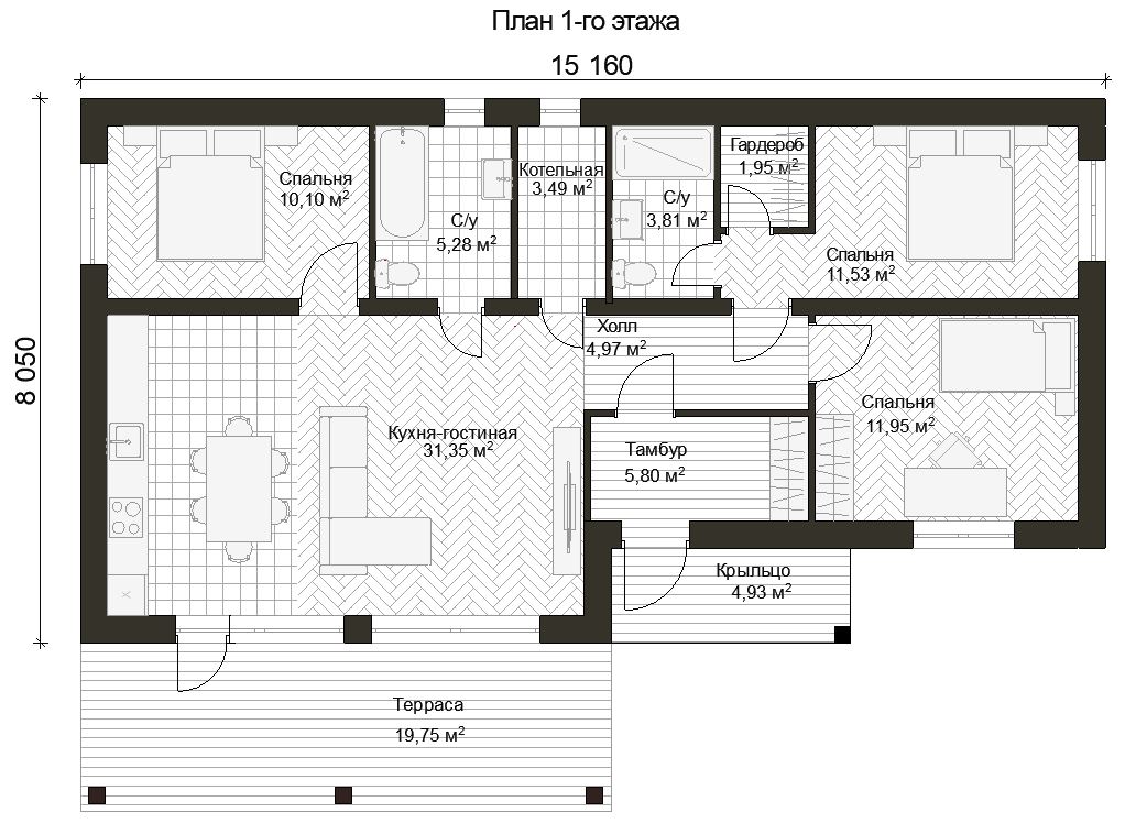 Современный одноэтажный дом из газобетона сочетает в себе стильный внешний вид и функциональную планировку. Его фасад выполнен в скандинавском стиле, с комбинацией штукатурки и дерева, что придает зданию уютный и гармоничный вид. Большие панорамные окна наполняют дом естественным светом и обеспечивают отличный вид на окружающую природу. Дом отлично подойдет для комфортного проживания небольшой семьи.