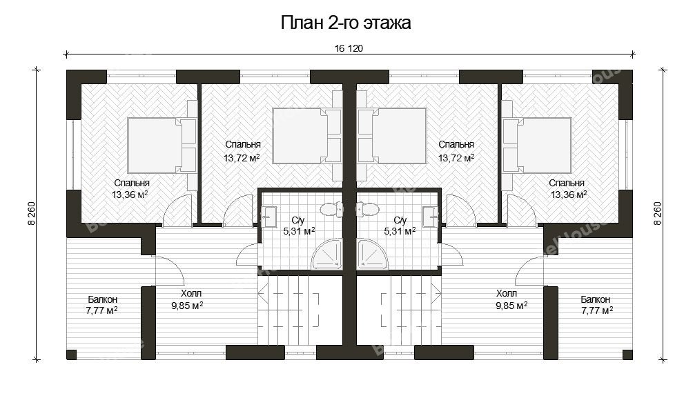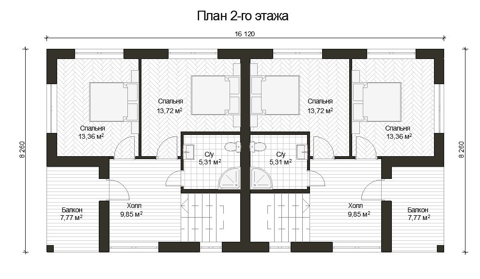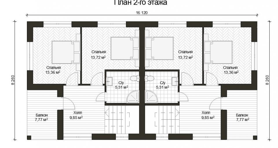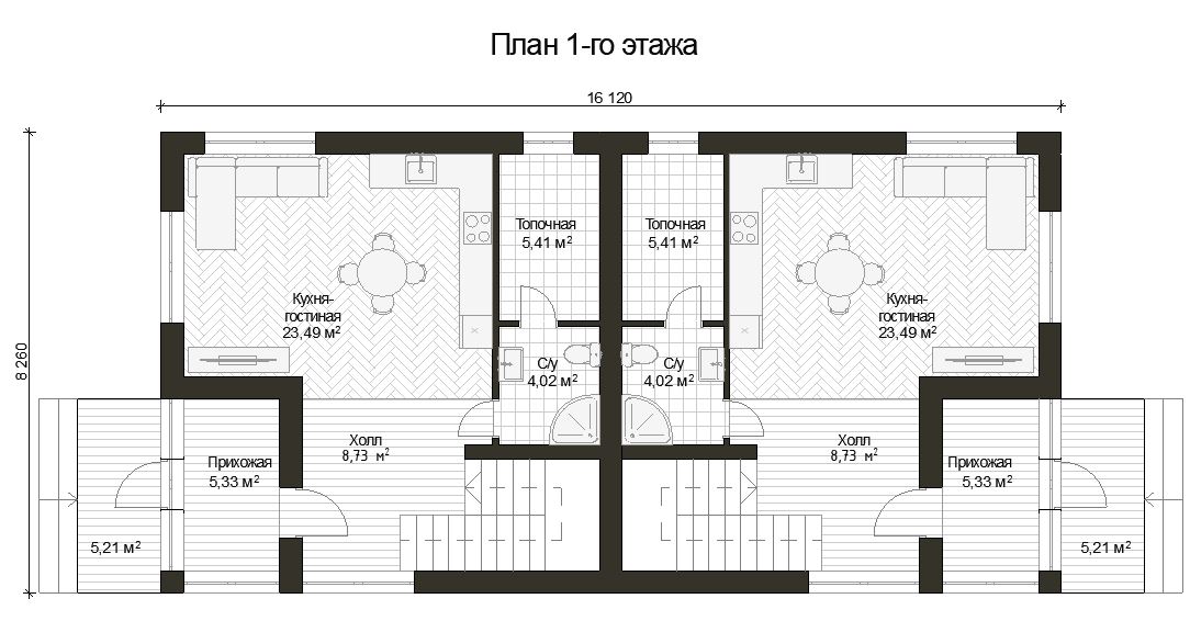 Стильный двухэтажный дом из газобетона на две семьи имеет общую площадь 251,7 квадратных метров, и рассчитан на круглогодичное проживание. Дом поделен на две зеркально идентичные независимые части с одинаковой планировкой. На первом этаже в каждой половине дома предусмотрены просторное крыльцо, прихожая, большой холл, санузел, топочная и кухня-гостиная, а на втором – две спальни, санузел, балкон и холл.