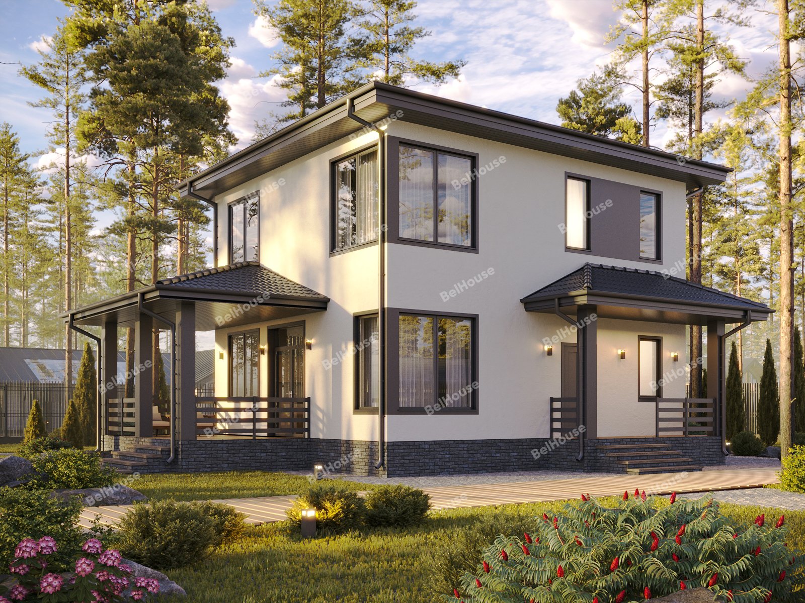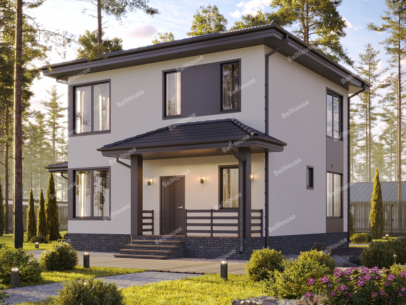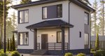 Отделка фасада на выбор: фасадные панели Альта-профиль, Docke, металлосайдинг Grand Line, фасадная плитка Hauberk, декоративная штукатурка Ceresit. Свесы кровли- виниловые перфорированные софитные панели. Отделка цоколя панелями