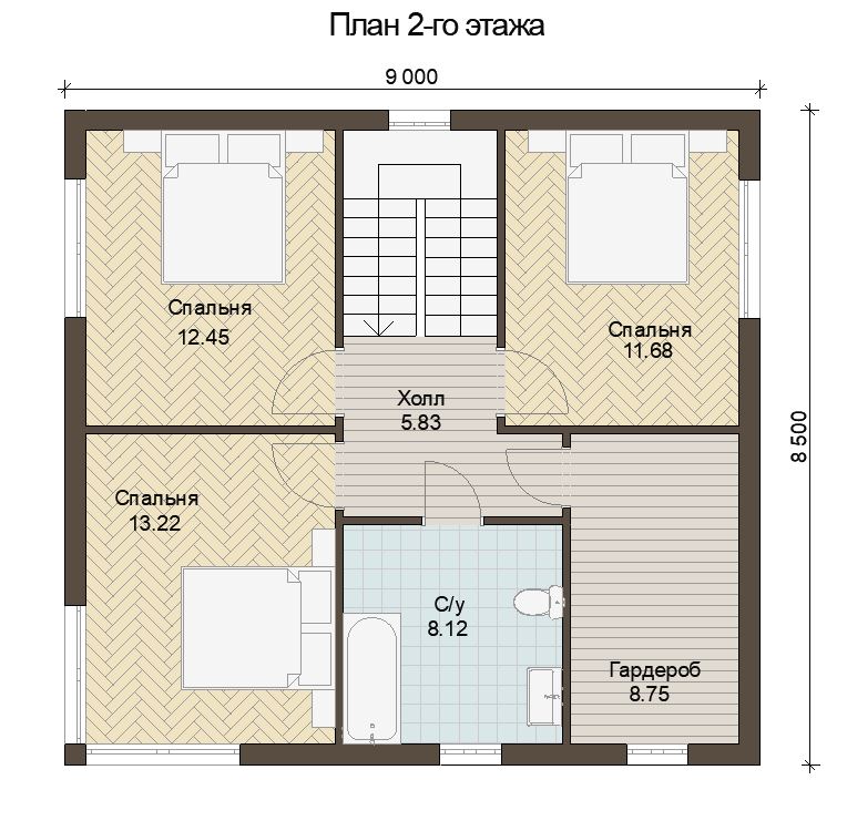 Комплект параллельно-поясных ферм (пол 1-го этажа) изготовлен на заводе из сухого (12-18%) строганного бруса ,сечением 145х45мм, соединенного металлозубчатыми пластинами MITEK. Весь силовой каркас и доборные элементы обработаны огнебиозащитным составом. Утепление перекрытий 1-го этажа 250 мм базальтовым утеплителем, 2-го этажа 150 мм. Пароизоляция и ветро-гидрозащита