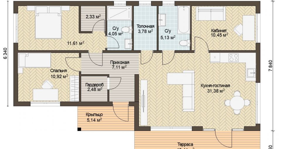 Стеновые панели изготовлены на заводе из сухого (12-18%) строганного бруса сечением 145х45мм,с наружной стороны зашиты ОСП плитой 9 мм. Весь силовой каркас и доборные элементы обработаны огнебиозащитным составом. Высота стеновых панелей 2,7 м. Утепление наружных стен 200 мм (150 мм + 50 мм перекрестно), межкомнатных перегородок 100 мм. Пароизоляция и ветро-гидрозащита, проклейка швов скотчем