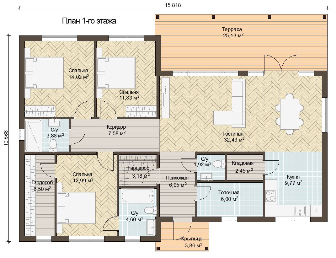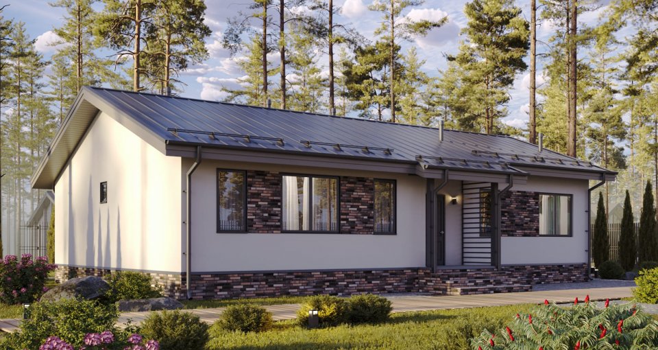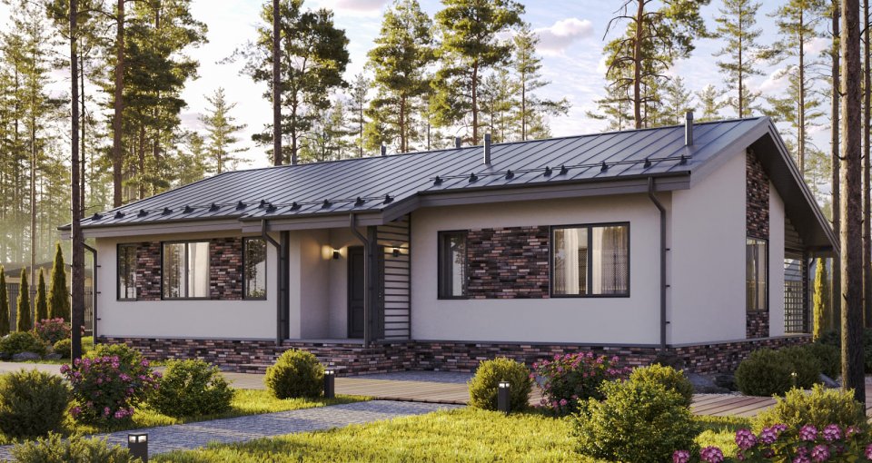 Отделка фасада на выбор: фасадные панели Альта-профиль, Docke, металлосайдинг Grand Line, фасадная плитка Hauberk, декоративная штукатурка Ceresit. Свесы кровли- виниловые перфорированные софитные панели. Отделка цоколя панелями