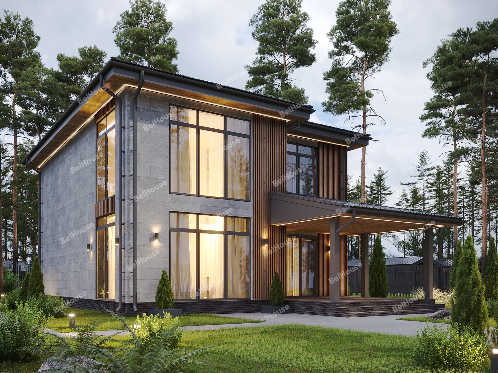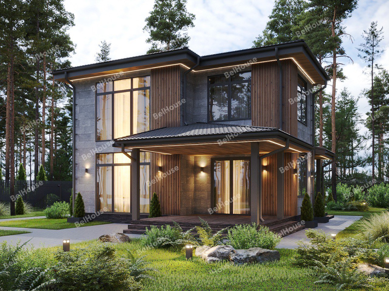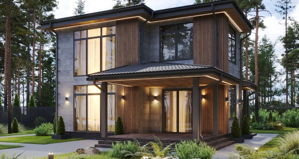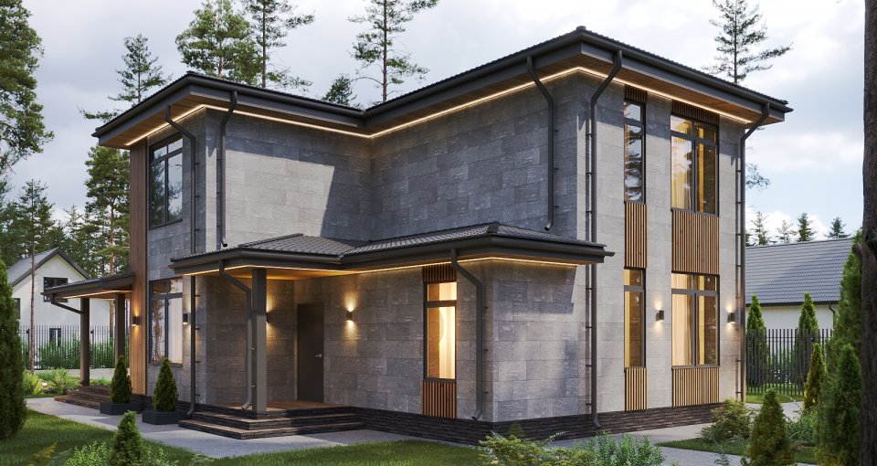 Отделка фасада на выбор: фасадные панели Альта-профиль, Docke, металлосайдинг Grand Line, фасадная плитка Hauberk, декоративная штукатурка Ceresit. Свесы кровли- виниловые перфорированные софитные панели. Отделка цоколя панелями