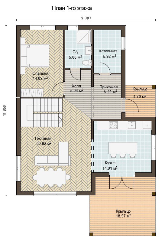 Устройство отопления: Монтаж водяного теплого пола на 1-м этаже: укладка теплоизоляционных матов, прокладка труб из сшитого полиэтилена, устройство коллекторной группы, полусухой бетонной стяжки, монтаж радиаторов на втором этаже (при наличии), установка котла газового или электрического, обвязка котельной, пуско-наладочные работы