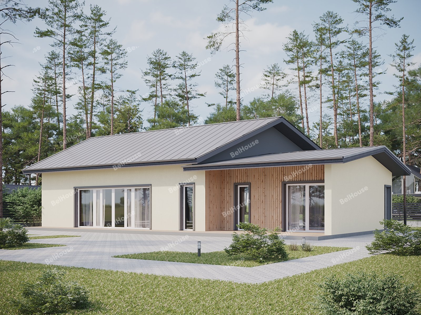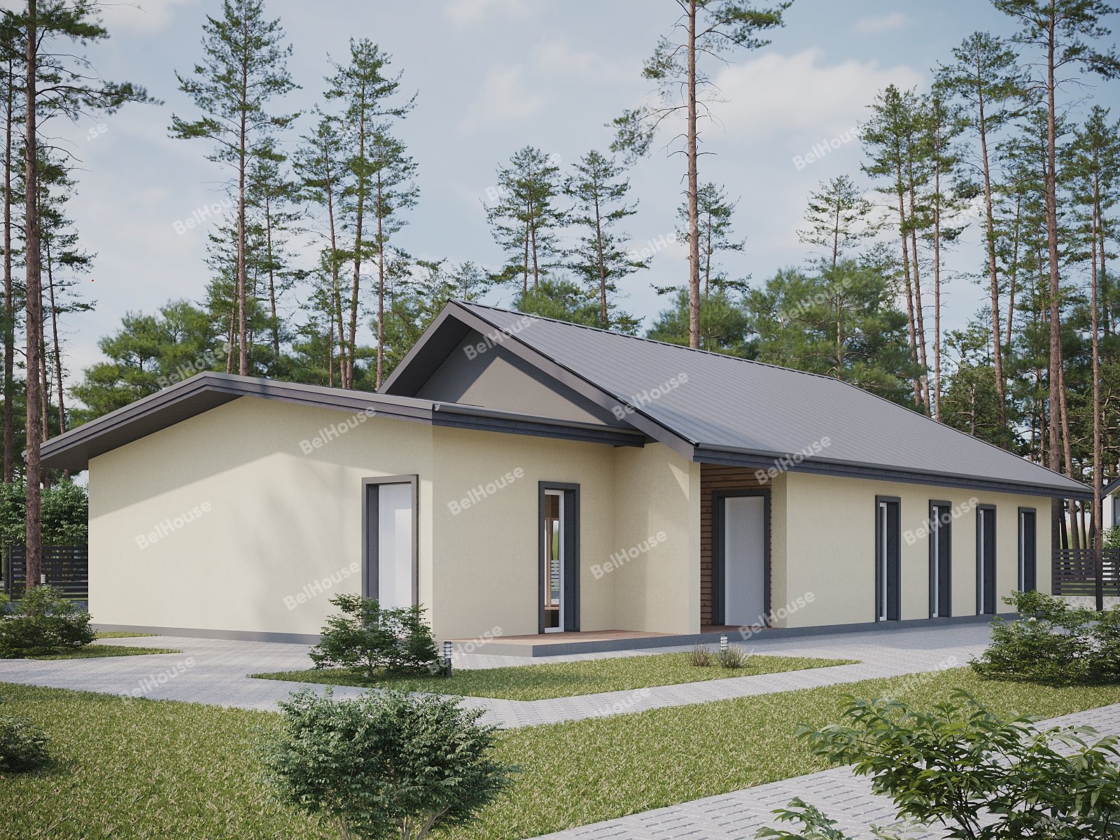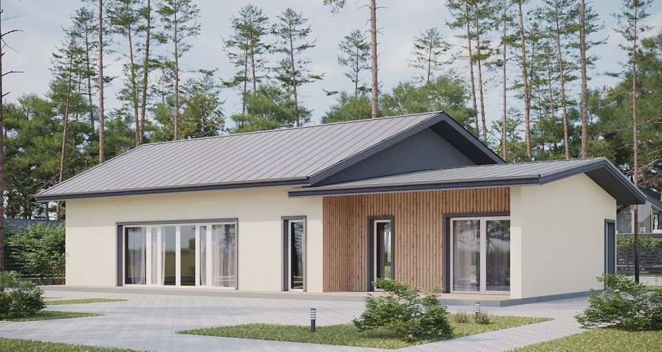 Отделка фасада на выбор: фасадные панели Альта-профиль, Docke, металлосайдинг Grand Line, фасадная плитка Hauberk, декоративная штукатурка Ceresit. Свесы кровли- виниловые перфорированные софитные панели. Отделка цоколя панелями