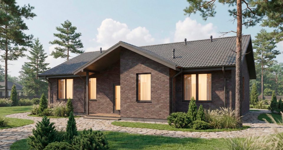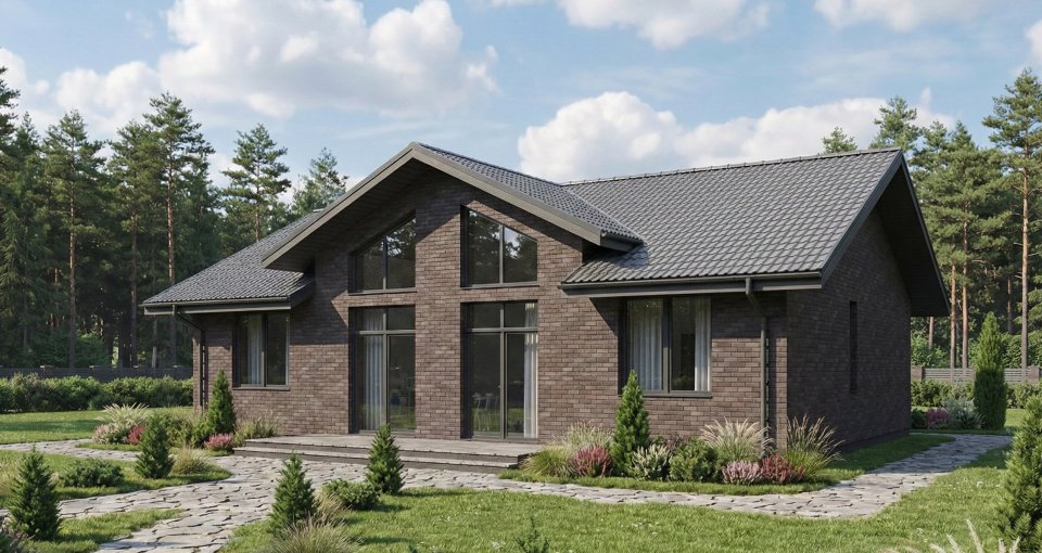 Отделка фасада на выбор: фасадные панели Альта-профиль, Docke, металлосайдинг Grand Line, фасадная плитка Hauberk, декоративная штукатурка Ceresit. Свесы кровли- виниловые перфорированные софитные панели. Отделка цоколя панелями