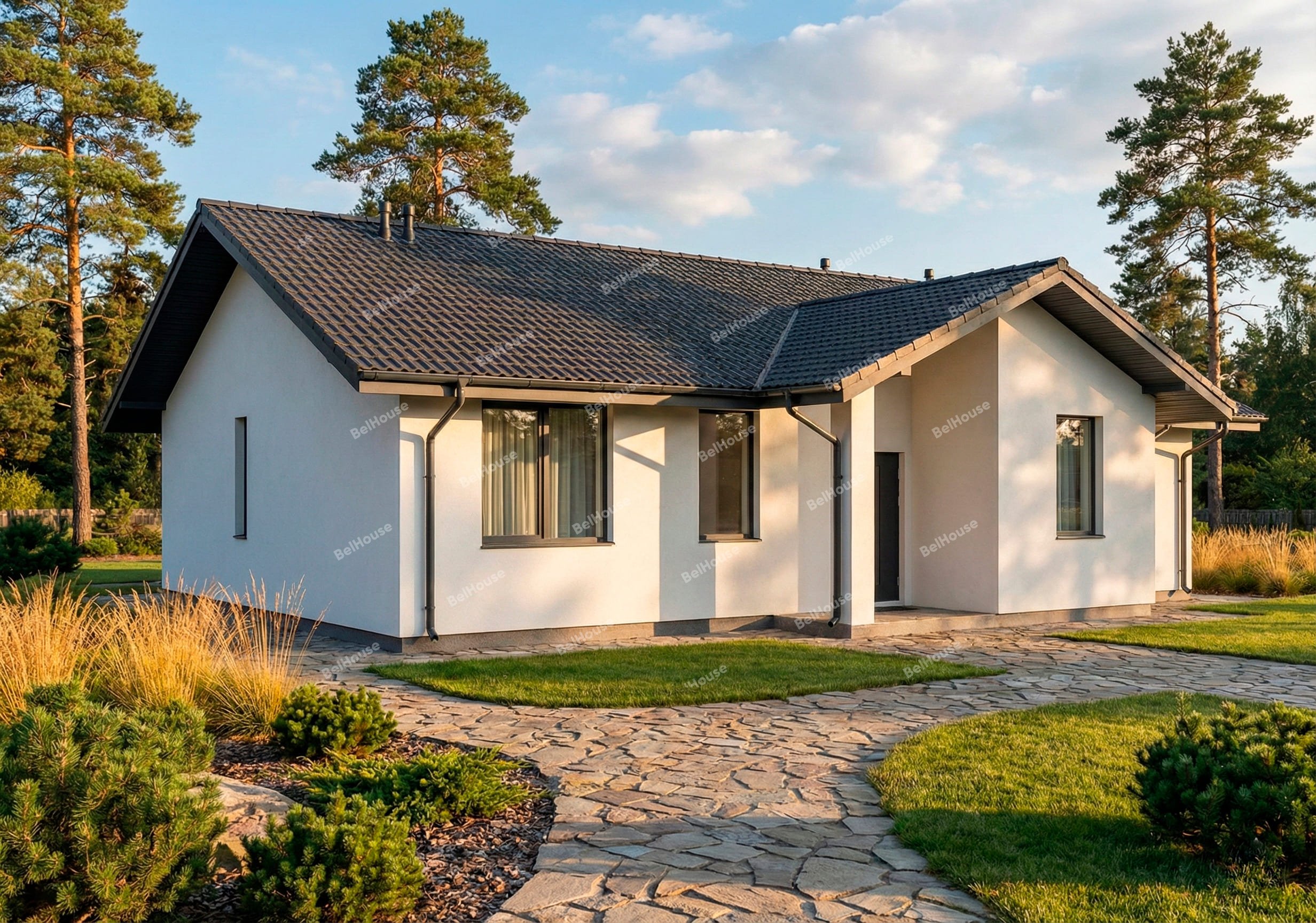 Отделка фасада на выбор: фасадные панели Альта-профиль, Docke, металлосайдинг Grand Line, фасадная плитка Hauberk, декоративная штукатурка Ceresit. Свесы кровли- виниловые перфорированные софитные панели. Отделка цоколя панелями