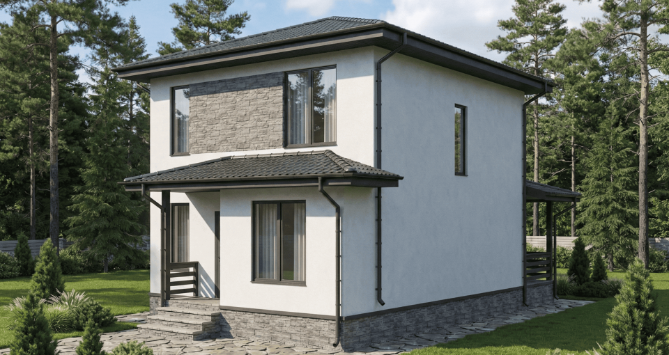 Отделка фасада на выбор: фасадные панели Альта-профиль, Docke, металлосайдинг Grand Line, фасадная плитка Hauberk, декоративная штукатурка Ceresit. Свесы кровли- виниловые перфорированные софитные панели. Отделка цоколя панелями