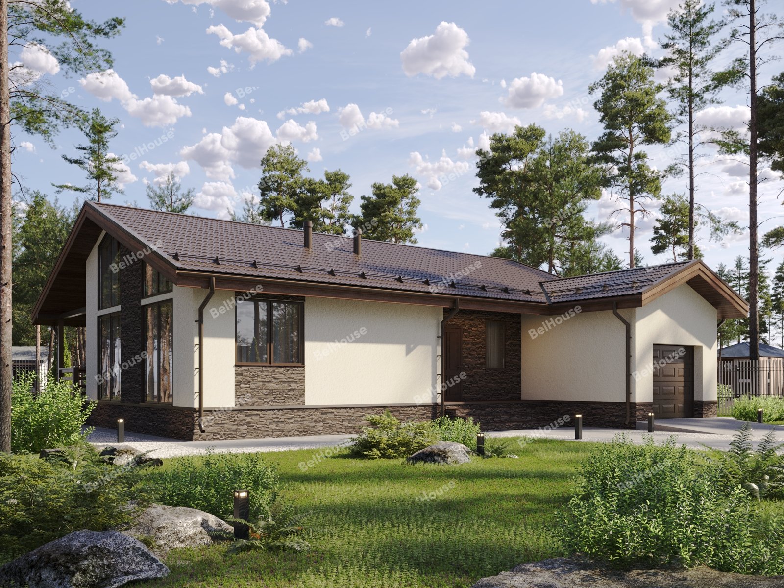 Отделка фасада на выбор: фасадные панели Альта-профиль, Docke, металлосайдинг Grand Line, фасадная плитка Hauberk, декоративная штукатурка Ceresit. Свесы кровли- виниловые перфорированные софитные панели. Отделка цоколя панелями