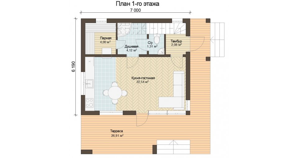Стильная двухэтажная баня с террасой площадью 126 квадратных метров прекрасно подойдет для круглогодичного отдыха за городом или в коттеджном комплексе. Благодаря удачной конфигурации баня подойдет даже для относительно небольшого участка. По проекту на первом этаже располагаются душевая с санузлом, парная, небольшой тамбур, кухня-гостиная и просторная терраса. Второй этаж разделен на две спальни, санузел и холл.